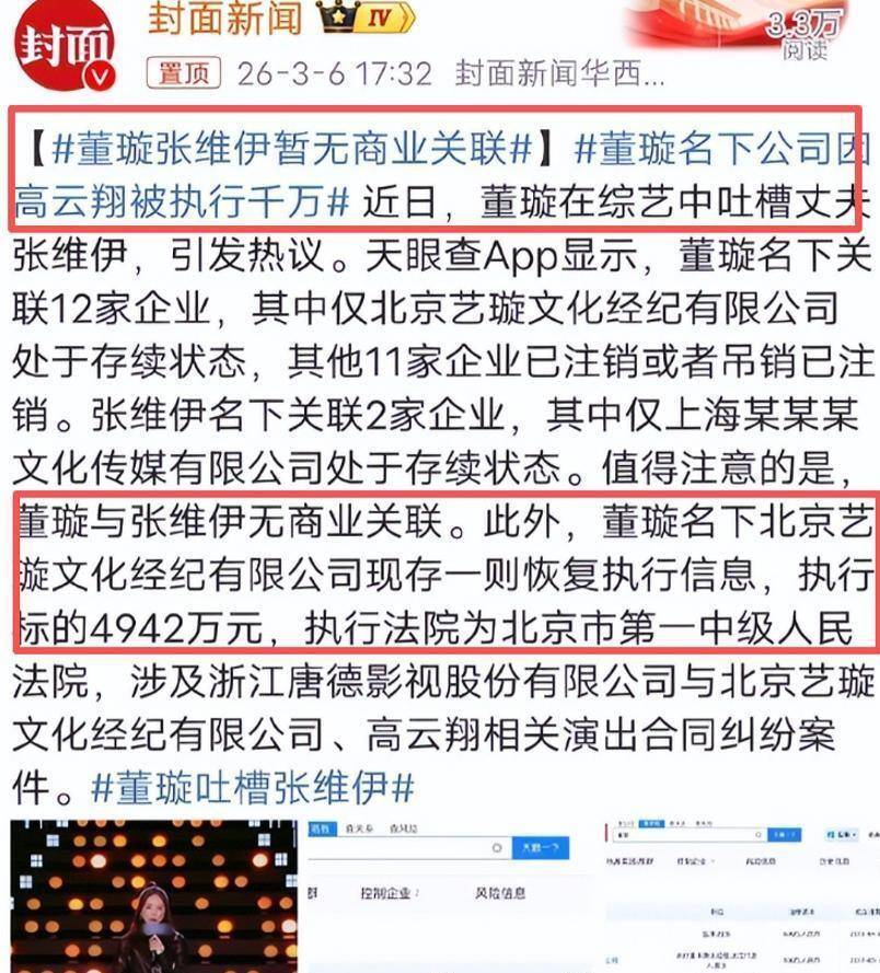 当董璇在脱口秀上,笑着吐槽现任丈夫张维伊签婚前协议时“看都没看直接签字”,还调侃“头婚确实容易头昏”时,恐怕没人想到,就在同一天,天眼查上正挂着她名下公司一笔高达4942万元的恢复执行信息。