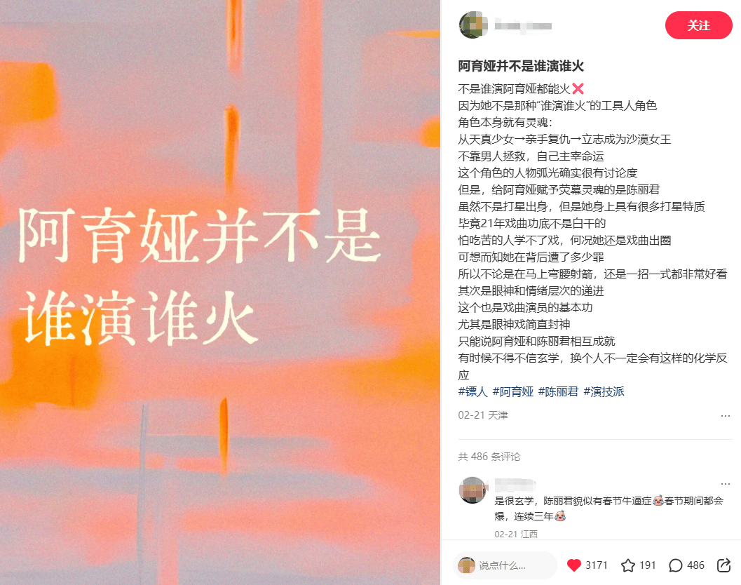 观众们纷纷表示,陈丽君把阿育娅的坚韧与柔软、野性、英勇、傲气演得淋漓尽致,每一个眼神、每一个动作都极具感染力,让人完全代入角色,仿佛阿育娅本就该是这般模样。大家不仅认可阿育娅这个鲜活立体的角色,更深深动容于陈丽君的努力与人格魅力,认可陈丽君褪去戏曲光环、以新人之姿全力以赴的谦逊,认可她直面挑战、亲力亲为的敬业,更认可她共情武行、心怀敬畏的温柔与真诚。