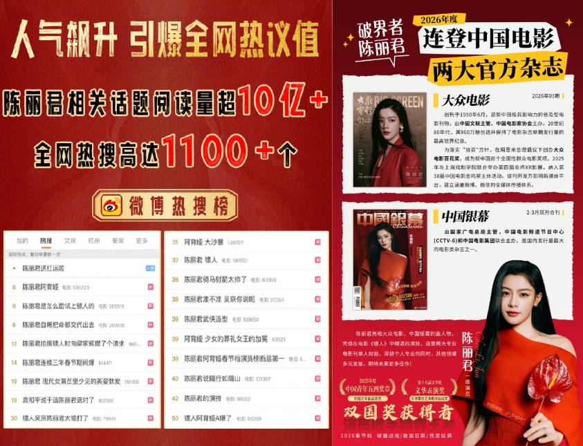 3月3日,《大众电影》官宣三月刊封面人物为陈丽君,赞其春节档惊艳亮相,尽显侠骨柔肠,跨界追梦不负韶华。此前,《中国银幕》亦聚焦其在《镖人:风起大漠》中的亮眼表现。陈丽君银幕首秀便获业内认可,连登两大专业电影刊物,两度以电影新人身份刊登唯一封面人物,陈丽君相关话题阅读量超10亿+,全网热搜更是超1100个,首次出演电影,精彩表现不仅获得业内认可,也成为了春节档观众最喜爱的角色之一。