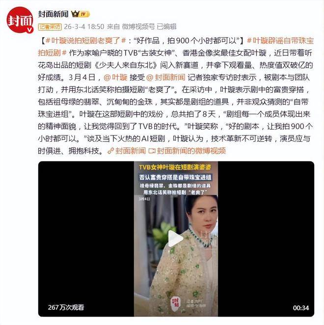 然而,随之而来的争议也不少。许多网友感叹:曾经的TVB一线花旦,如今却在短剧中饰演婆婆,与她的同期演员佘诗曼等人依旧在拍摄大制作的剧集相比,似乎让人感到有些咖位下降。对此,叶璇的回应却异常清晰且犀利:内容没有长短之分,只有好看和不好看。她认为,短剧同样需要演员的专业演技,并且毫不排斥任何角色,强调剧本的好坏才是最重要的,她也表示:做妈妈也无所谓,她更看重的是剧本能否给她足够的发挥空间。 面对如今短剧行业的火热和AI技术的迅猛发展,叶璇展现了她开放的态度,她认为技术的革新不可逆转,演员也应该与时俱进,但她同样强调,尽管技术可以不断进步,真人表演的灵魂依旧无法被替代。这一番言辞展现了她的深思熟虑与对职业的热爱。 叶璇的跨界尝试,不仅仅是她演艺生涯中的一个新尝试,也如同一面镜子,反射出娱乐圈的严酷现实——对于中年女演员来说,选择越来越少,机会也变得更加苛刻。然而,叶璇通过这次短剧的表现,用自己的行动和成绩证明:真正的咖位,并不取决于载体和番位的高低。一句简单的老爽了,既是她对专业环境的怀念,也是她回归表演初心的象征。她用8天时间完成的,不仅仅是一场表演,而是一场精准的情怀杀和实力的展现。对于真正的演员来说,舞台的大小并不重要,演技和职业精神才是永不降维的核心。