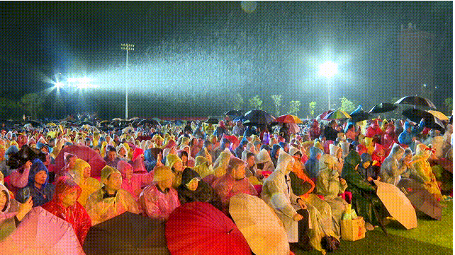如果说雨棚代表了温暖的守护,那么舞台下的景象则是这场晚会最坚实的底色。那场雨,成了观众热情的催化剂。现场的观众几乎没有人在意湿透的衣衫。无论是从阳东赶来的观众,还是从阳江市区开车而来的歌迷们,他们都身着统一的雨衣,手中挥舞着荧光棒,近万名观众在雨中汇成一片流动的星河。