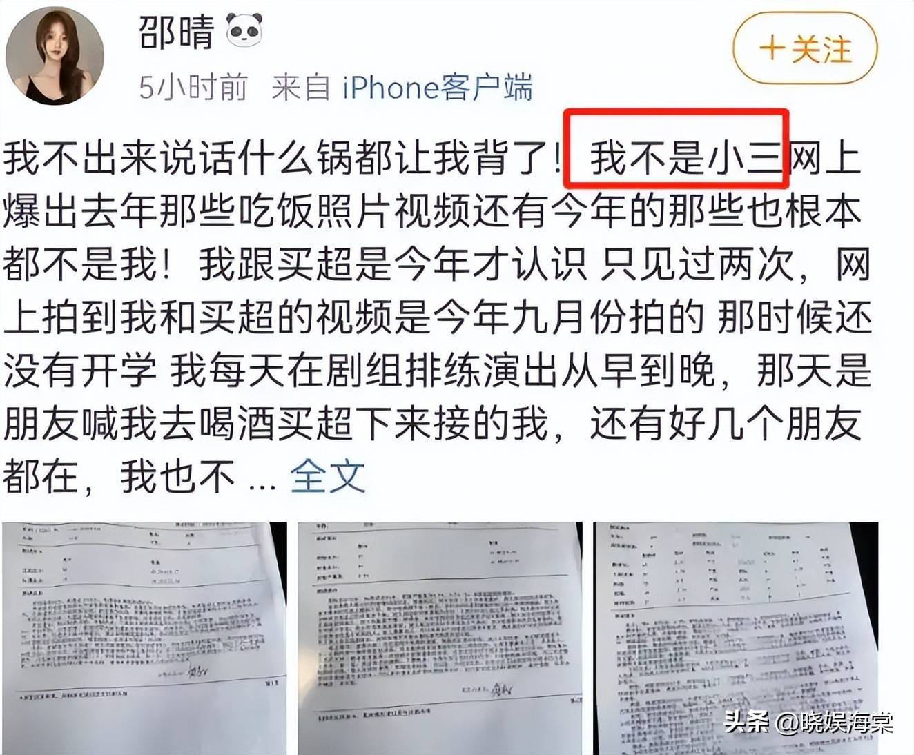 2022年,狗仔曝光视频:买超深夜搂着邵晴的腰走入酒店,一夜未出,画面清晰,铁证如山。邵晴当时还在北电读书,比买超小十三岁,青春靓丽,她第一时间否认自己是小三。而买超却从头到尾一言不发,让张嘉倪承受舆论风暴,两个年幼的孩子也被推上风口浪尖。