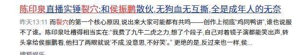 三个月前,坊间就已经传出两人搭档有裂痕的消息,那段时间相声圈的流言真是五花八门。有人说是分赃不均惹的祸,有人说私下结下了芥蒂,更有甚者编出了堪比宫斗的情节。毕竟在相声圈,搭档分开往往难有好下场,要么撕逼,要么明争暗斗,甚至老死不相往来。陈印泉和侯振鹏最初是在网络论坛相识的,两人完全是出于对相声的热爱凑到一起的。没有经纪公司包装,没有资本运作,纯粹是你爱说我也爱,志同道合便自然搭了伙。从庙会、酒吧、茶馆一路摸爬滚打,直到2008年一起加入当时名声大噪的嘻哈包袱铺。那时候说相声不是为了大钱,一场演出下来,分的钱顶多够俩人凑一顿宵夜。但他们的干劲无人能比,为了一个包袱能讨论一整夜,这种纯粹的快乐,成名之后很难再找。