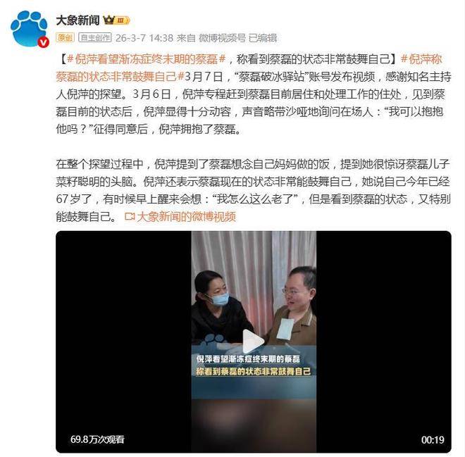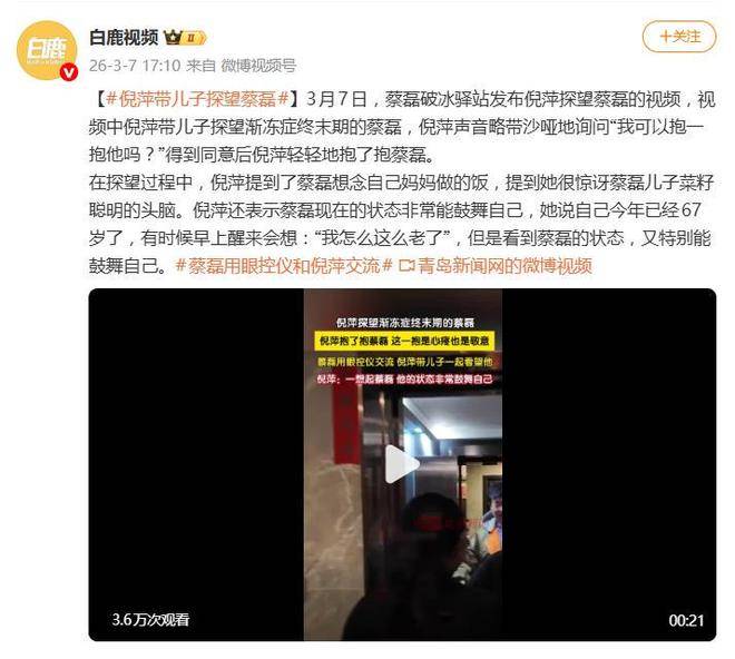 一句轻轻的我可以抱抱他吗?,让无数网友的内心瞬间崩溃。3月7日,知名主持人倪萍探望渐冻症抗争者蔡磊的视频引发了广泛的关注。当倪萍看到蔡磊全身瘫痪、仅能转动眼球却依然在坚持为社会贡献自己的力量时,她的声音哽咽,那个柔和的拥抱,不仅是一个简单的动作,更是一种超越言语的敬意与共情,凝聚着无尽的情感。