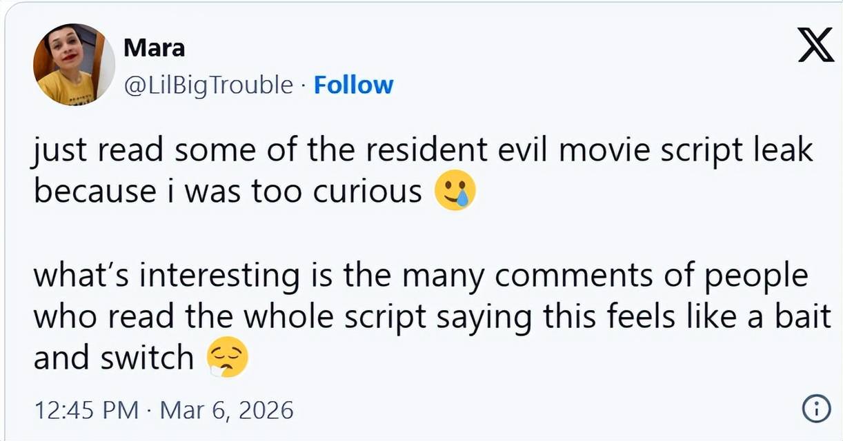 由扎克·克雷格执导《生化危机》重启真人电影还未上映,其完整剧本已在网上泄露,玩家褒贬不一,主要的批评在于脱离游戏剧情。
