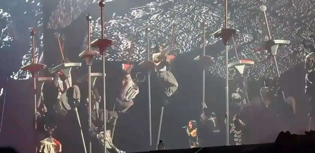 然而,道具的更换并未削弱舞台的锋芒。那晚,蔡依林以全开麦状态完成了近三小时的高强度唱跳演出,每一次舞步、每一次呼吸都精准到位,零失误的表现赢得了观众的高度赞誉。真正令人屏息的瞬间,却源自一项古老非遗技艺的惊艳加入。当她演绎《你也有今天》时,来自江苏溧阳、拥有2400多年历史的爬竿杂技首次亮相流行演唱会舞台。二十余位特技演员在剑之丛林的布景中凌空翻跃、精准悬停,每一次腾挪与发力都与音乐节奏紧密契合,将人体极限的控制力化作视觉奇观。在蔡依林的舞台叙事中,这项民间技艺被赋予了新的情绪张力,成为当晚最震撼的经典画面。
