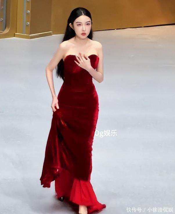 还有一位穿红色礼服的网红,精修图中她皮肤白皙,曲线玲珑,散发出成熟女人味。然而现实中,脸部填充感过重,看上去生硬而不自然,加上仪态普通,让这身漂亮的礼服似乎也失去了应有的光彩,令人有些惋惜。