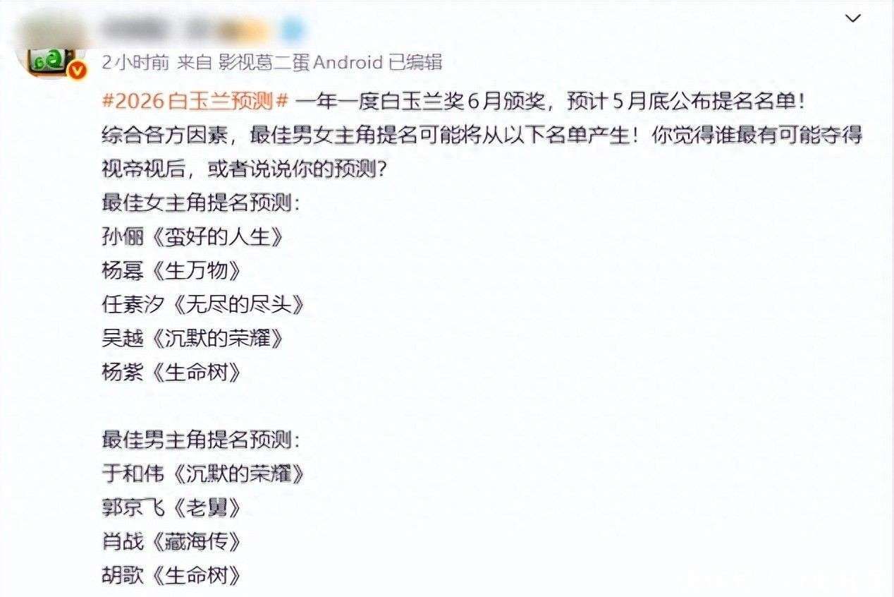 阅读本文之前,真诚邀请您轻轻点击屏幕上的关注按钮,这不仅方便您随时参与互动、转发分享,也能让您获得更深度的观剧体验与情感共鸣。内容创作从来不易,您的每一次点击和停留,都是对我们创作团队最温暖、最实在的鼓励与支持。2026年第32届白玉兰奖颁奖盛典将于6月盛大举行,而提名名单将在5月底正式公布。尽管官方尚未发声,观众们的热情早已按捺不住,纷纷依据剧集播出期间的真实热度、平台数据、社交讨论量与口碑发酵,自发整理出一份颇具公信力的民间提名预测榜。