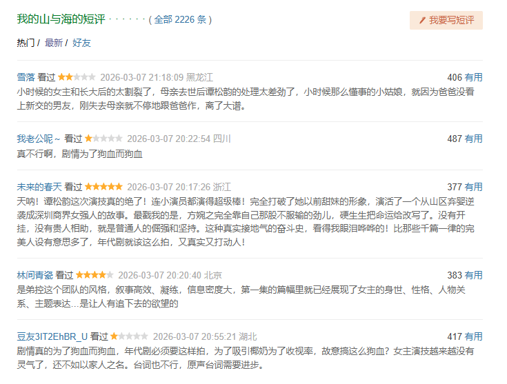 诚如我对该剧首篇剧情分析所言,狗血、苦情、硬转折、缺乏叙事基础逻辑等评价,已经成为《我的山与海》在普通剧迷当中的共识性的评价了。随着更多剧情的放出,普通剧迷们对于这部电视剧的评价,使用以上词汇的频率越发增大。在豆瓣短评区域,应援好评和普通观众差评,可谓是截然相对的。目前,前排评论当中,五个短评,竟然已经出现三个差评。
