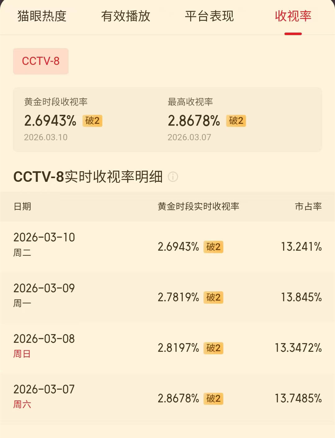 3月11日,酷云和CSM均开出了电视剧《我的山与海》播出4天的收视率数据。在这两家数据平台上,这部电视剧都出现了收视率三连降的局面,可谓是喋喋不休了。CVB收视率数据方面,尚未开出《我的山与海》的第4日的收视率数据,但是,该剧在首播第二日,已经把收视率拉低到了2%前后,第二日、第三日和第四日,其实都是在打“收视率保2的争夺战”了。