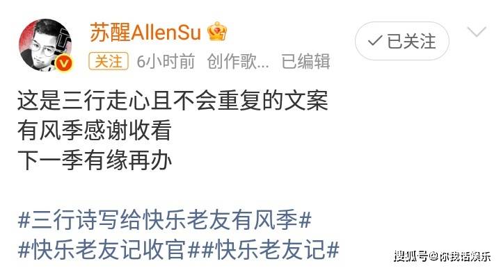 一句“今日收官,不说再见”,道明艺人的心声!毕竟,这一期综艺节目结束了,但是每一位参与其中的艺人,真情还在!正如苏醒写的那样:“下一季有缘再办”。那么,《快乐老友有风季》收官以后,什么时候又可以看到,再就业男团艺人一起参与其中的综艺呢?