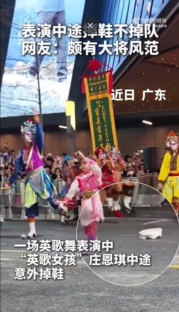 据3月9日报道,广东一场英歌舞的表演中,发生了一个小插曲,却意外地让7岁的小舞者庄恩琪再次成为网络热议的焦点。在表演过程中,她的一只鞋子突然脱落,然而这名年纪尚轻的女孩并未因此慌乱失措。反而,她将捡起掉落的鞋子的动作巧妙地融入了舞蹈的节奏当中,继续保持着从容不迫的状态,完整地跳完了整场舞蹈。这段视频迅速在网上爆红,网友纷纷对她的冷静表现表示钦佩,赞叹她拥有了真正的大将风范!