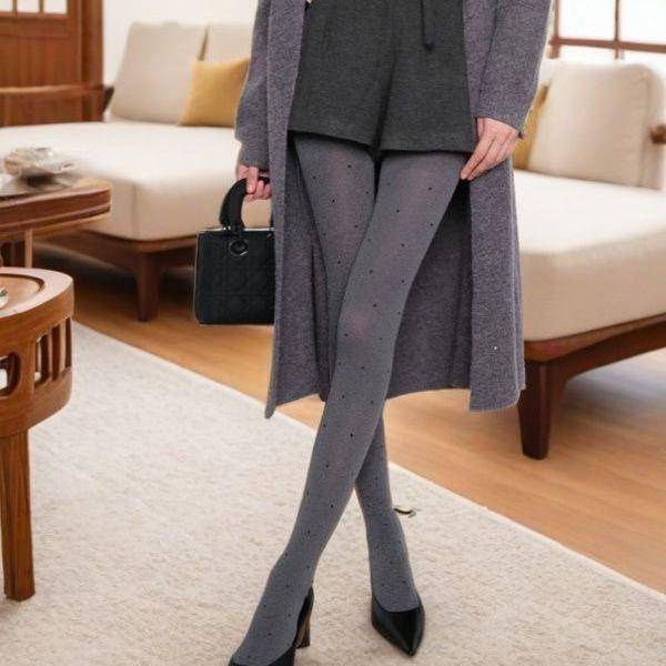 灰色圆点丝袜为秋冬穿搭注入一丝俏皮感。这款采用天鹅绒材质的连裤袜,表面点缀着精致的爱心图案,复古又不失时尚。春秋加厚款设计,15-20度穿着正合适,内里添加了透气网眼层,久坐办公室也不会闷热。