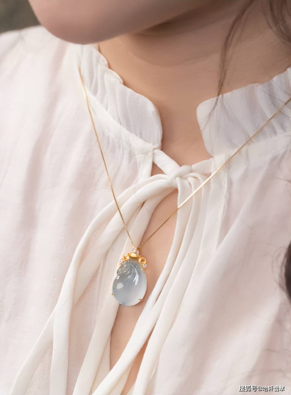 这是一款以钱袋形象为设计灵感的锁骨链,选用的料子种水冰润,质地细腻,带着些许翠色飘花,自然光下泛着柔和光泽。因料子本身品质够好,所以整体造型并不复杂,雕刻时也避免了多余的线条。首要就是打磨圆润饱满的袋身,鼓鼓囊囊,一眼就是“装满财富”的富足模样,寓意财库充盈、衣食无忧。袋口以细致绳结收紧,褶皱处的线条流畅且弧度自然,既具布艺的柔软真实质感,又显出翡翠的温润坚韧特质,象征“守住福气、不漏财气”。周身以爪镶工艺固定,扣头采用元宝纹样设计,并以钻石点缀,在提升整体时尚精致感的同时,更将招财进宝的寓意具象化。