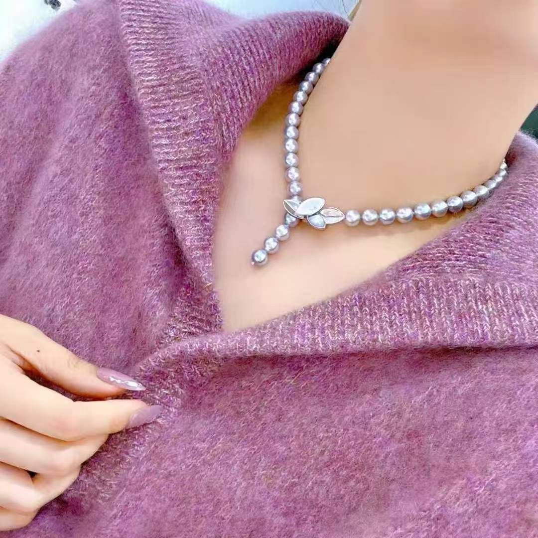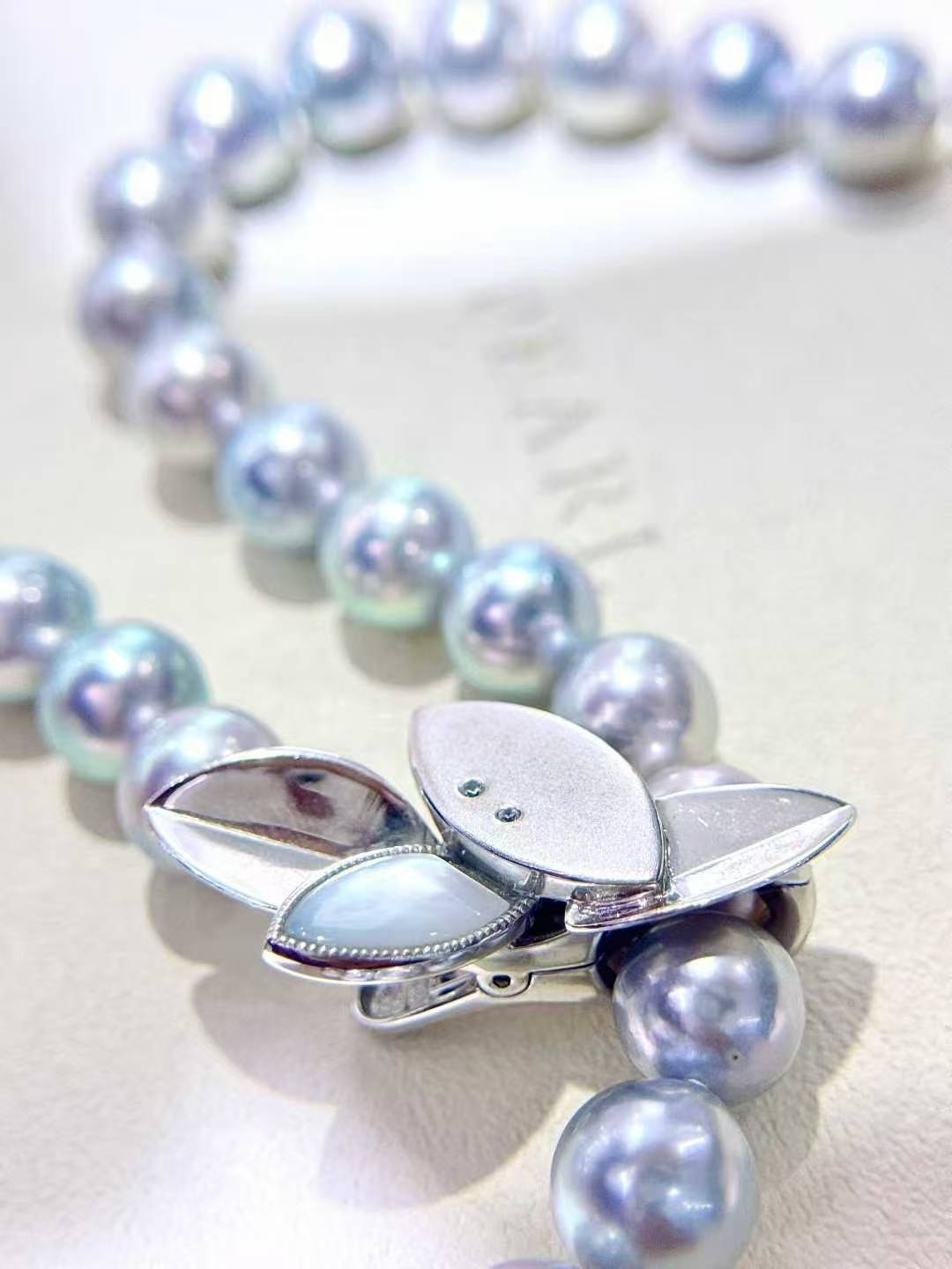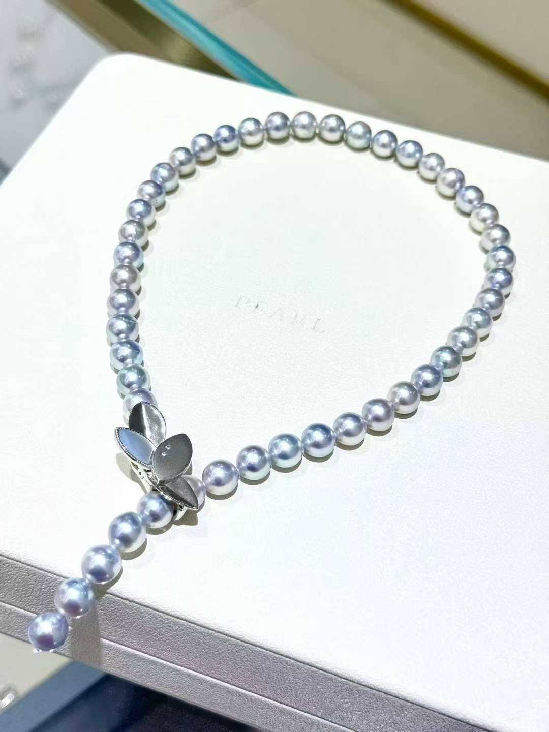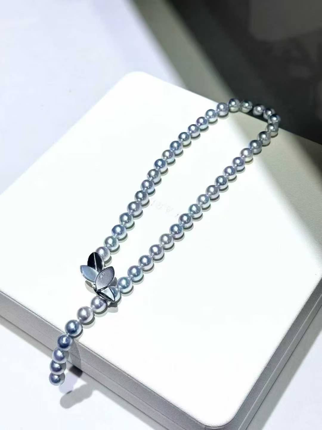 akoya灰珠贝壳扣 8.5-9mm天然颜色akoya银灰蓝色 真多麻色正圆微瑕疵 搭配日本纯银扣 简约高级 清冷感无敌 让简单的衣服都变得高级大气 长度43cm左右