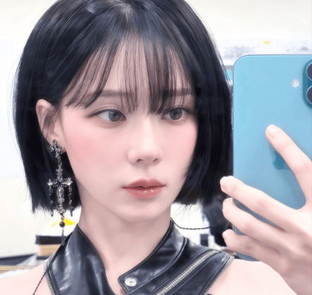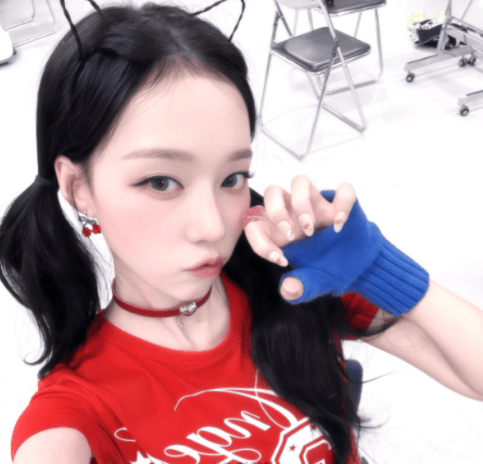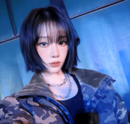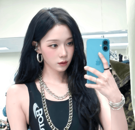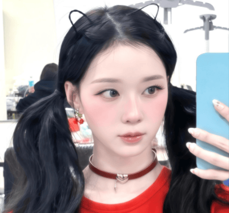 拍摄这组自拍时,金玟庭手持蓝色手机对镜自拍,眼神清冷而坚定,无表情却满含故事感。背景是简单的后台环境,没有多余装饰,完美突出她的造型与气质,这让她在一众自拍中独树一帜,堪称“爱豆私服天花板”。