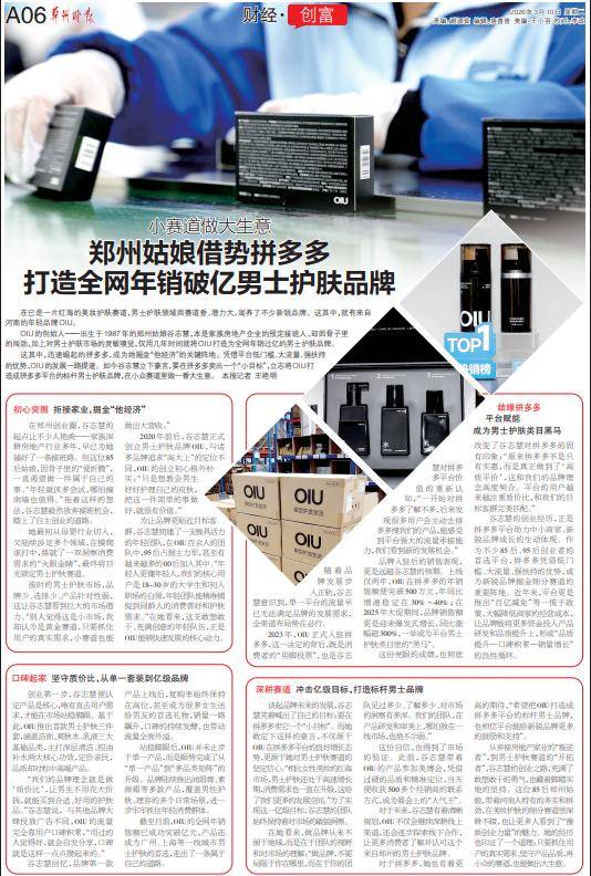 这其中,迅速崛起的拼多多,成为她掘金“他经济”的关键阵地。凭借平台低门槛、大流量、强扶持的优势,OIU的发展一路提速。如今谷志慧立下豪言,要在拼多多卖出一个“小目标”,立志将OIU打造成拼多多平台的标杆男士护肤品牌,在小众赛道里做一番大生意。