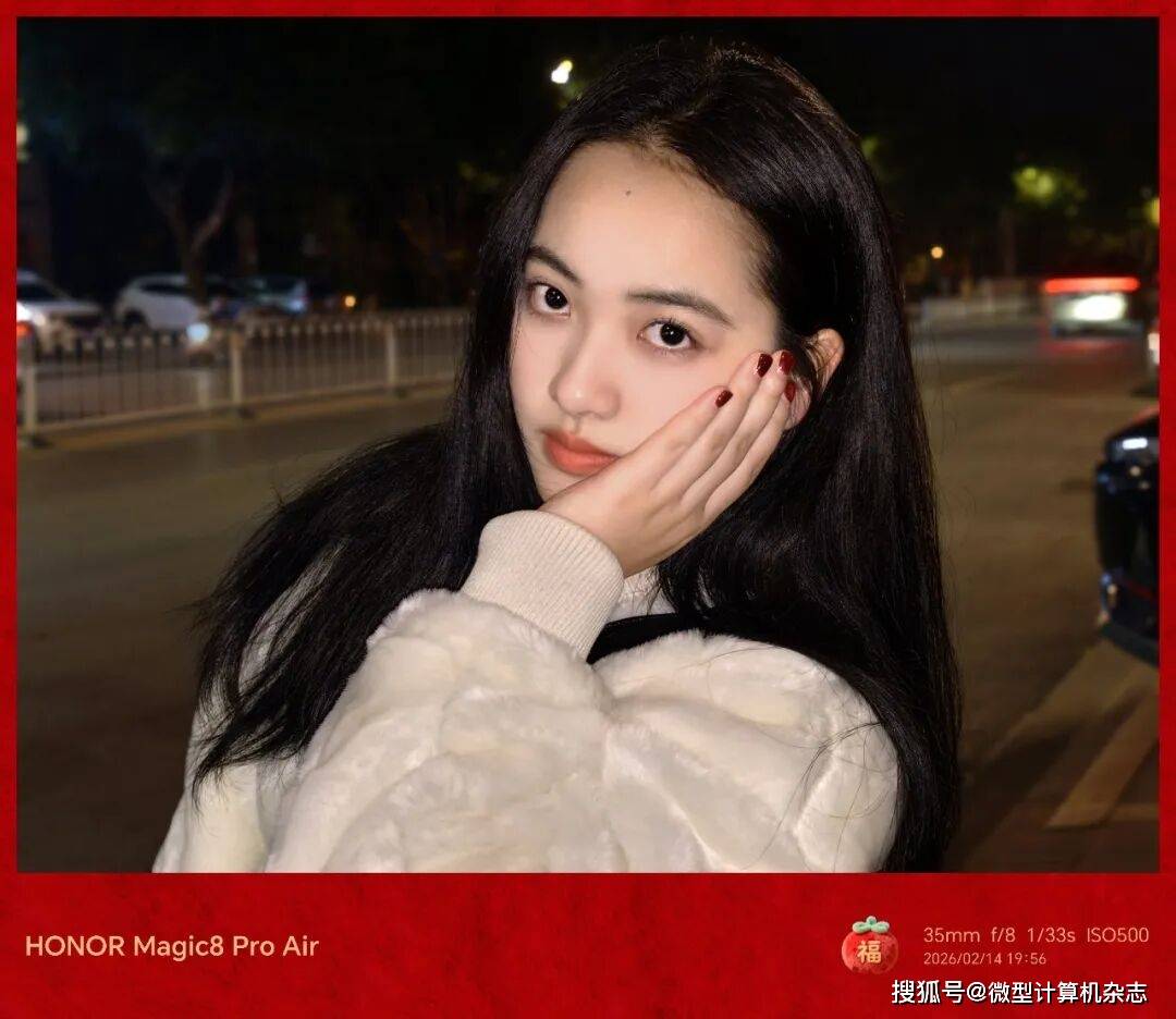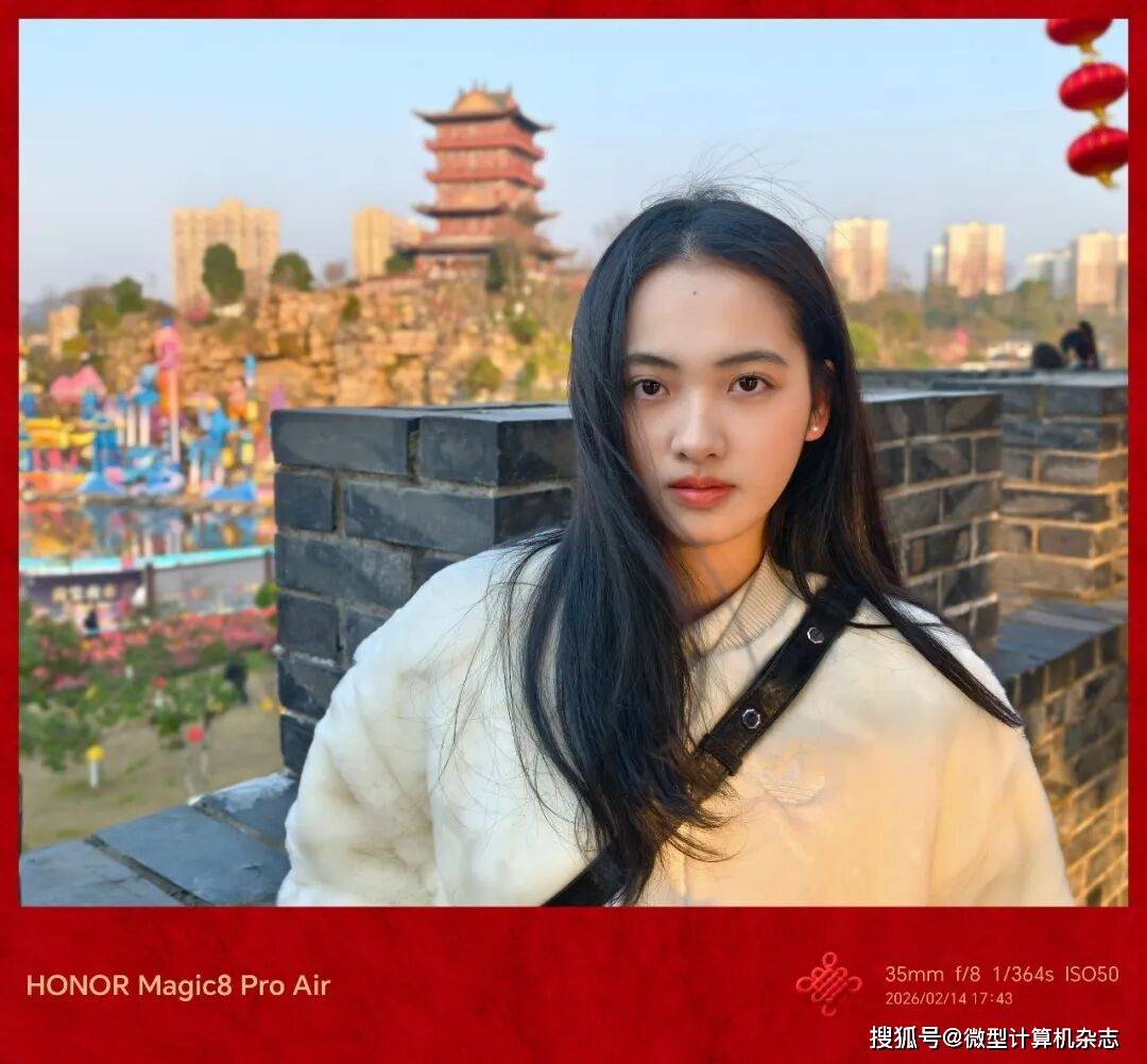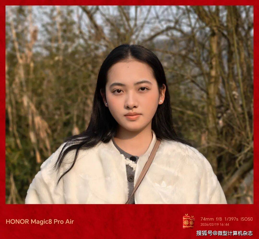 荣耀Magic8 Pro Air人像模式覆盖23mm、35mm、46mm、74mm和148mm共5个经典焦段,适配环境人像、半身照和特写等多种场景。用其拍摄的人像基本都能做到有效的“美颜”,在保留真实感的基础上遮盖瑕疵,使得成像效果自然,并且虚化能够精准到发丝,细节处能通过考验。AI变焦阵列闪光灯在夜间人像拍摄时表现出色,它可智能调节光线强度,让人像肤色更自然,避免了“黑脸”“过曝”等问题,轻松拍出质感人像。此外,手机还内置了“AI闪光重塑”“灵感帮拍”和“AI追色”等实用功能,不仅能优化拍摄体验还可提升出片率。