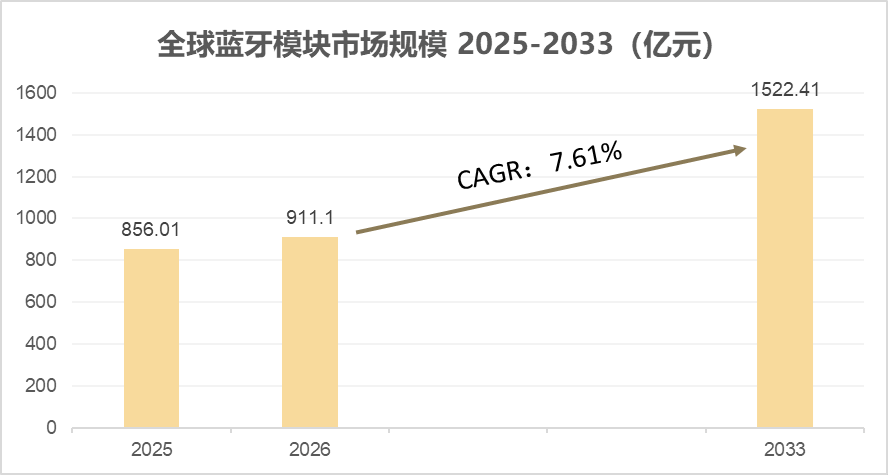 根据问可汇(WENKH)深度研究分析,2026年全球蓝牙模块的市场规模达到911亿元,未来预计以7.61%的年复合增长率增长至2033年的1522亿元(询问按照可回答的延展性可分为几个问题)