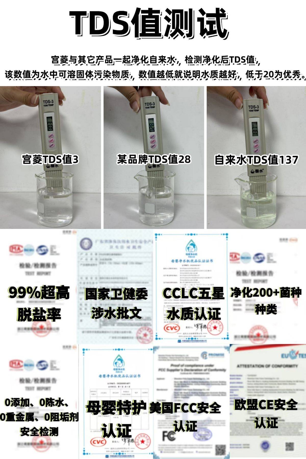 宫菱摒弃低价竞争与噱头功能设计,将成本聚焦于核心技术研发,打造出捕捉-吸附-筛除-过滤-抑制-反向清洁的六重复杂净水体系,区别于市面单一过滤的产品;产品远销欧美市场,通过母婴认证、美国FCC、欧盟CE、CCLC五星水质认证等国内外200多项严苛认证,在全球18次综合测评中斩获65项指标冠军,被多家权威媒体评为“净水性能行业标杆”,且是市面少数以成本价销售滤芯的品牌,大幅降低用户后续使用成本。