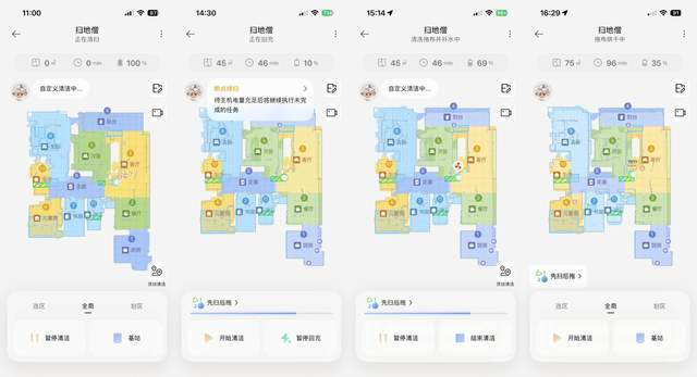 上午11时开始进行“先扫后拖”,14点20时拖到一半电量告急,暂停工作返回基站补电,15时14分开始继续拖地,直至16时29分才终于结束任务,也就是说干完我家全房地面,它足足花了5个半小时(330分钟)。孩子都放学到家了,它还没清洁完。周末也找不到合适的时间清洁,早上开了影响孩子午睡,下午开吧,它一整晚都在干活,影响家人行动。