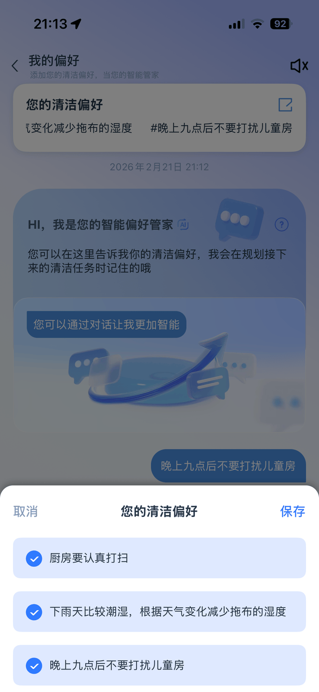 另外,它的保姆级语音指导也值得狠狠表扬。从开机、联网、建图,到扫地、拖地、集尘、烘干拖布等,每一个环节都有清晰明了的语音同步讲解,不仅帮助用户了解每一个功能的用途和使用方式,也让老人和小白用户能轻松上手,完全不用担心不会用。