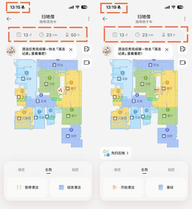 下午14:00时开始进行“先扫后拖”,15:52完成扫地工作,15:56开始拖地,17时32分结束任务(一次完成,中途没有暂停工作),机器人剩余电量67%,共计花费212分钟,清洁速度是我家X牌旗舰扫地机器人的1.5倍。早上开了不影响孩子午睡,下午遛娃前开了,回来家里就干净无声,真的太有救赎感了。
