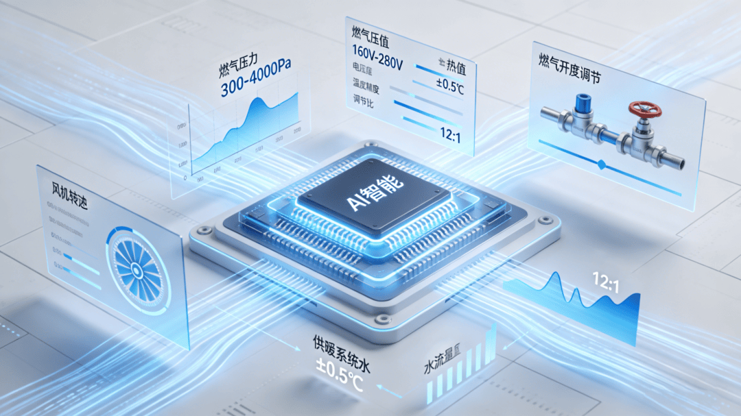 通过实时监测燃气压力(300-4000Pa宽幅适配)、电压(160V-280V)、热值变化、室内外温度(精度±0.5℃)、供暖系统水流量与温度,AI智能芯片会动态计算最优空燃比,自动调节燃气阀开度、风机转速,实现10:1超宽调节比,确保燃烧始终处于最佳状态。