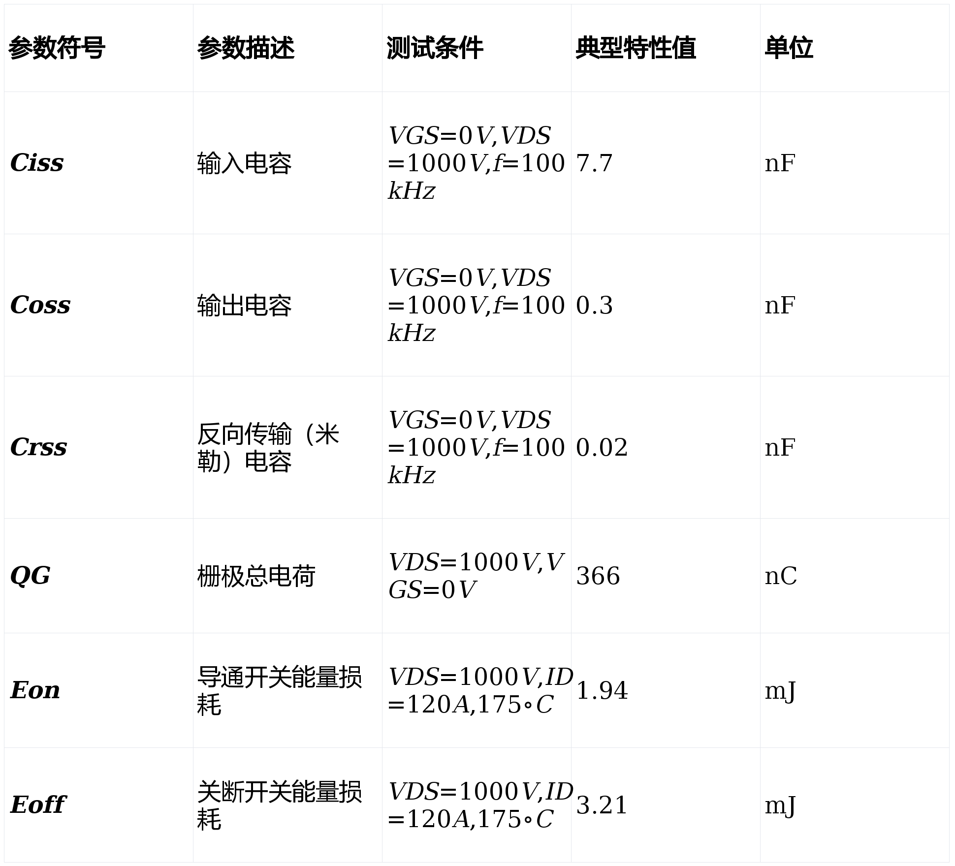 在动态开关能量消耗(Switching Energy)的精确测试中,条件被设定为严峻的1000V母线电压与120A满载电流。在175∘C的极端高温下,其开通能量损耗(Eon)低至1.94mJ,关断能量损耗(Eoff)也仅为3.21mJ 。令人瞩目的是,其在室温(25∘C)下的开通损耗Eon(2.92mJ)甚至略高于高温环境,这主要归因于室温下体二极管反向恢复行为参与程度的微小变化 。这种总开关损耗被控制在区区数个毫焦耳级别的表现,是传统大功率硅基IGBT模块完全无法触及的物理边界,赋予了系统在50kHz甚至100kHz以上极高频率下运行,依然能够将整机转换效率稳稳钉在99%以上的硬核实力 。