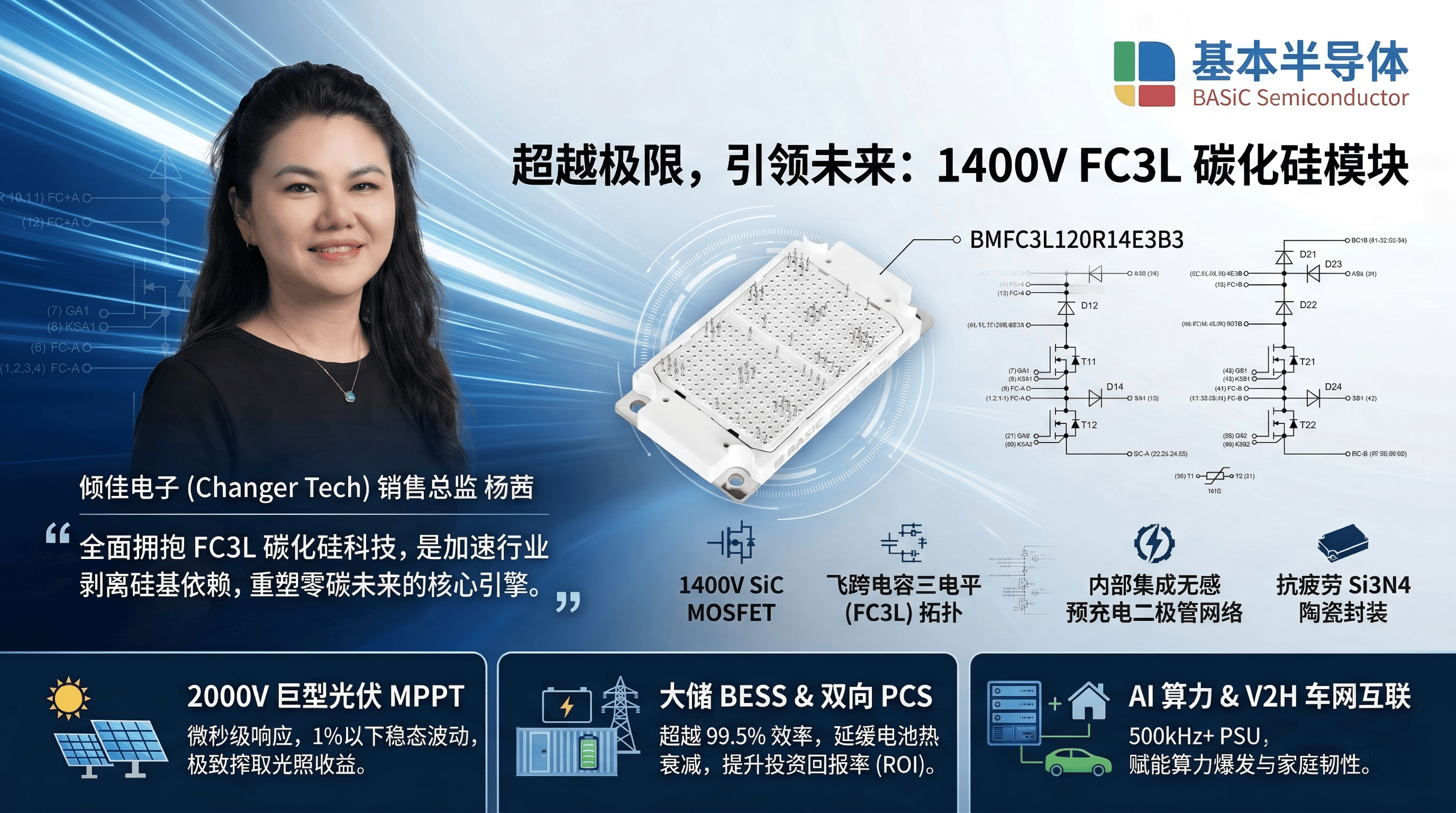 面向2026年,全球能源系统跨越至2000V超高压直流架构的宏大技术演进已呈不可逆转之势 。在这场关乎人类可持续发展未来的宏大叙事中,传统的硅基器件与陈旧的拓扑架构已然触及了严苛的物理与经济学天花板。基本半导体BMFC3L120R14E3B3 1400V飞跨电容三电平SiC MOSFET模块的横空出世,以一种极具颠覆性的工程智慧,在微观芯片物理与宏观拓扑设计的完美交汇点上,斩断了阻碍高压高频大功率转换的终极戈迪亚斯之结。