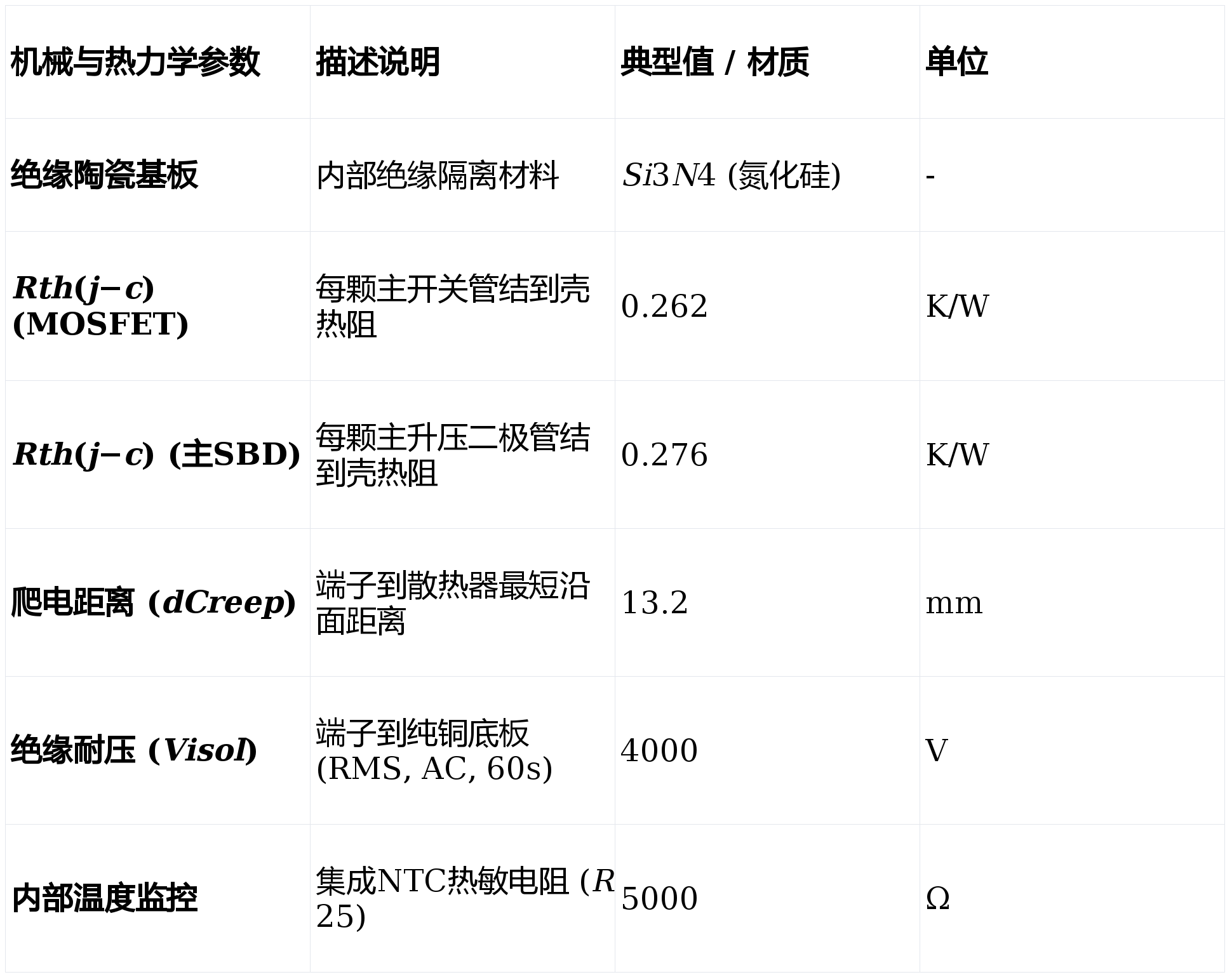 针对光伏风电等恶劣户外环境对高可靠性的诉求,该模块抛弃了传统的氧化铝(Al2O3)陶瓷衬底,全面升级为具备航天级可靠性的氮化硅(Si3N4)陶瓷基板 。氮化硅材料完美融合了极高的热导率与非凡的机械断裂韧性,从物理机制上彻底克服了在剧烈温度波动下因热膨胀系数不匹配导致的覆铜层剥离现象,赋予了模块长达数十年的超强热循环(Power Cycling)寿命极限 。配合纯铜基底,主MOSFET芯片的热阻被压榨至极限的0.262K/W,确保了高频极速开关产生的瞬态热量能够被顺畅疏导 。