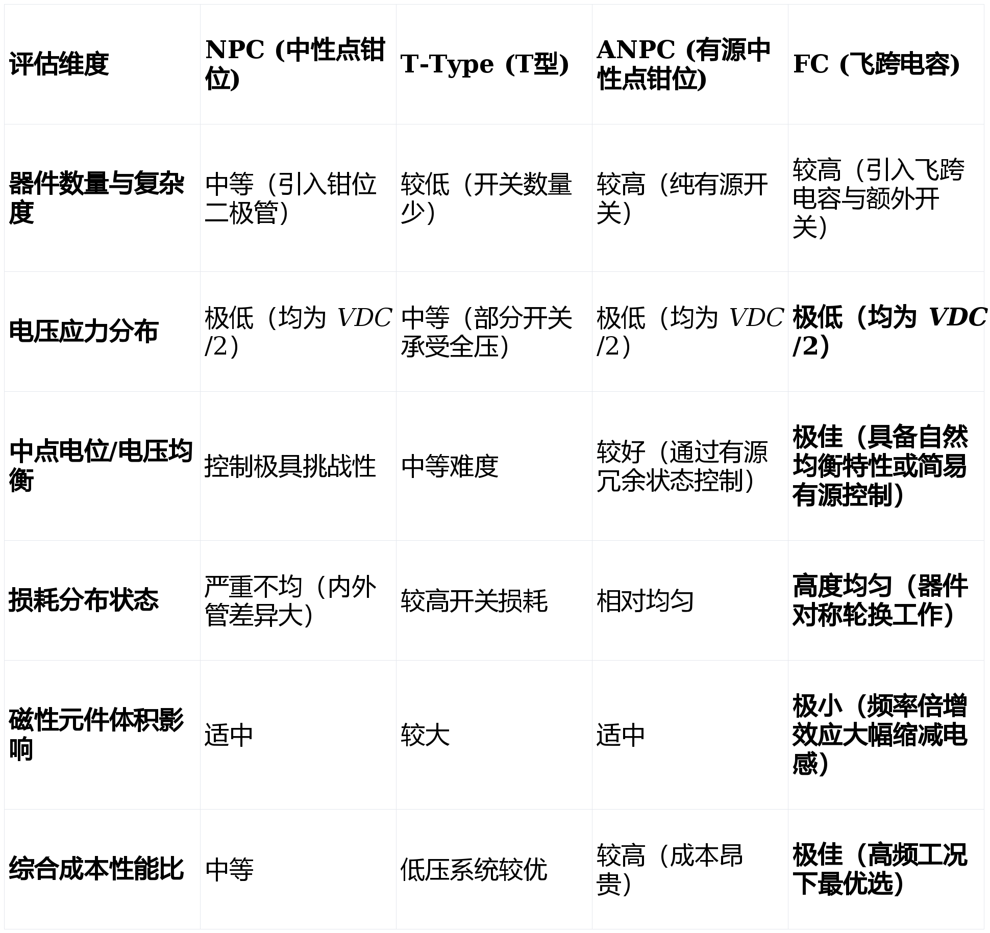 为了解决这一物理矛盾,三电平拓扑应运而生。通过引入第三个电压电平(通常为直流母线电压的一半),每个功率开关器件所需承受的电压应力被完美减半 。在三电平架构的细分领域中,主要存在中性点钳位(NPC)、有源中性点钳位(ANPC)、T型(T-Type)以及飞跨电容(FC)四种主流方案 。下表详细对比了这些主流三电平拓扑的综合特性: