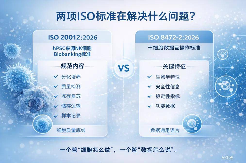 细胞治疗的发展,不是“有没有研究突破”,更重要的是:过程是否规范,数据是否清晰,证据是否能够持续积累。这次两项ISO国际标准的发布,一项为 NK细胞资源管理设定质量底线,另一项为干细胞数据建立通用语言。