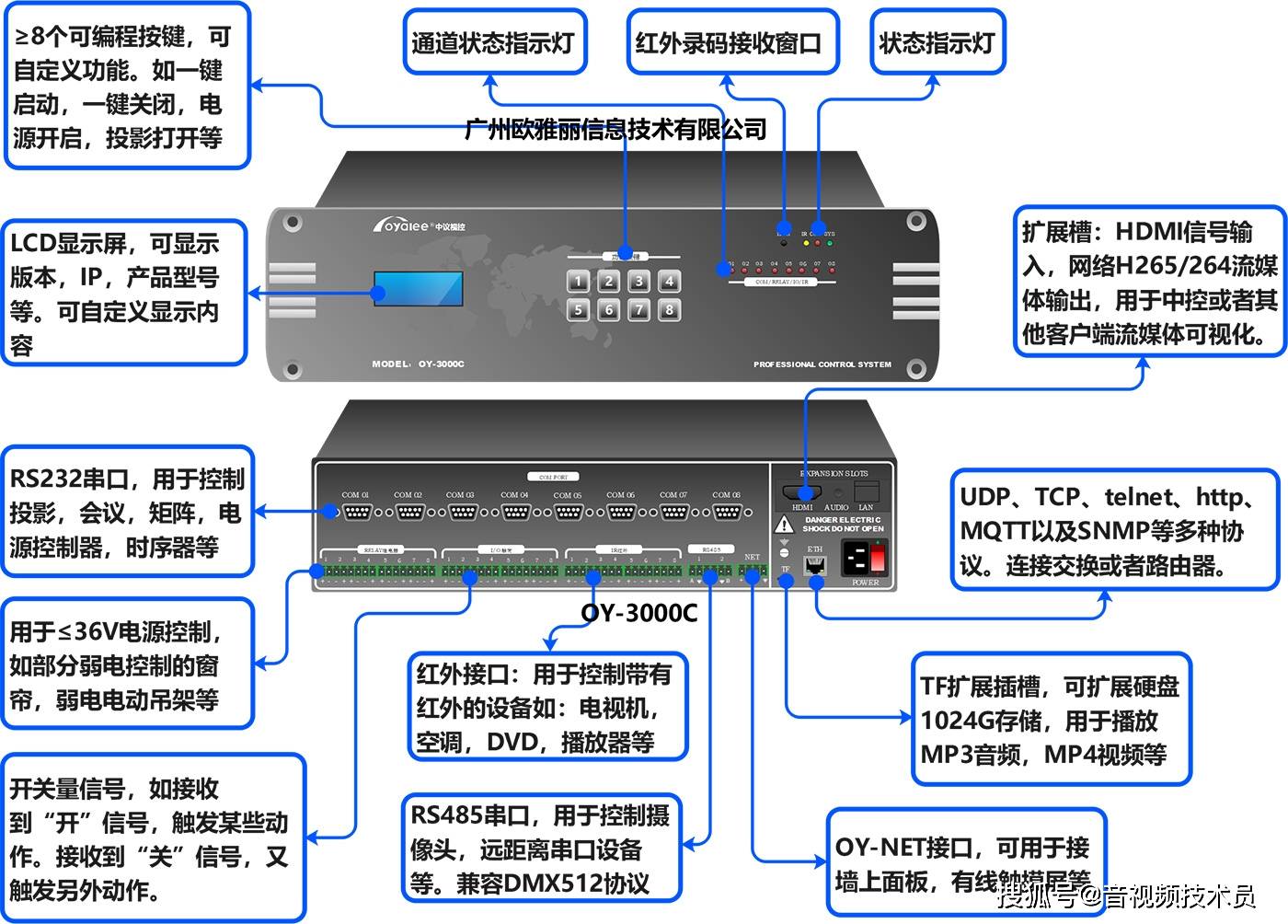 在数字化办公飞速发展的今天,多功能视频会议室已成为企业协同、远程沟通、商务洽谈的核心场景,而各类音视频设备、环境设备的高效协同,直接决定了会议效率与体验。OY-3000C可编程网络中控系统主机作为广州欧雅丽信息技术有限公司自主研发的国产化核心设备,以强大的集成控制能力、灵活的可编程性和稳定的运行表现,成为多功能视频会议室的“得力干将”,轻松破解多设备操控繁琐、协同不畅的痛点,为各类会议场景提供智能化、一体化管控解决方案。