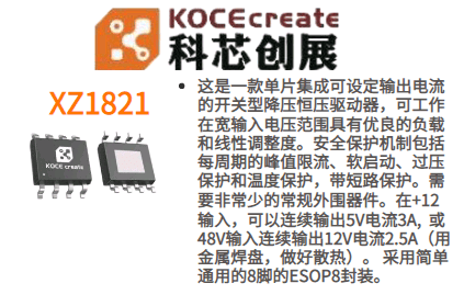 产品概述 这是一款单片集成可设定输出电流的开关型降压恒压驱动器,可工作在宽输入电压范围具有优良的负载和线性调整度。安全保护机制包括每周期的峰值限流、软启动、过压保护和温度保护,带短路保护。需要非常少的常规外围器件。在+12输入,可以连续输出5V电流3A, 或48V输入连续输出12V电流2.5A(用金属焊盘,做好散热)。 采用简单通用的8脚的ESOP8封装。