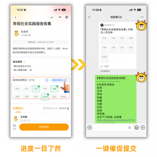 点一下“通知未接龙人员” ,将未交名单转发到群里,不需要手动核对和私聊通知,接龙效率大大提高。