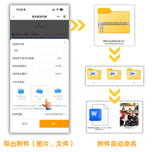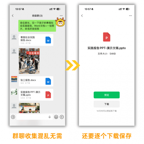 以前,需要让每位学生家长微信私发给你Word文档和一张照片,再右键另存为→重命名→将它们汇总到一个文件夹,还要对着名单检查谁没交,私聊催促一下,等这些人交上来后再重复前面的保存步骤,最后上报给主任。