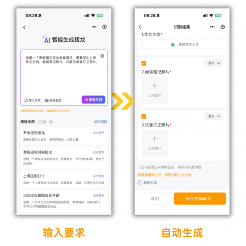现在只需说“收集语文作文电子版,需要学生上传作文文档、阅读笔记照片”,10秒就自动生成接龙。学生提交后,所有作业文件自动整理好,我直接下载就行,节省了90%的时间。