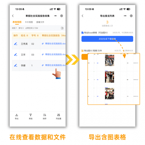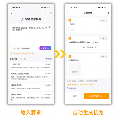 姓名是文本输入框,学号是数字,Word文档是文件收集,活动照片是图片收集。每一个字段的类型都自动匹配好了,就算是不会用智能产品和手机的长辈,也能轻松发起接龙,完全0门槛上手。