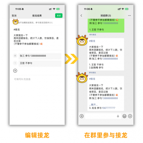 “大家接龙一下周末团建报名,统计下人数”“各位家长,请接龙填写学生基本信息…...”