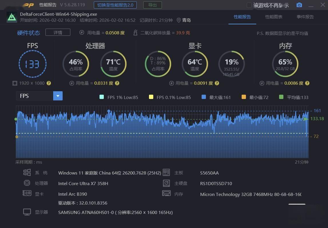 《三角洲行动》的游戏设置中没有 1200P 选项,因此我们改用在 1080P 分辨率 + 低画质预设 + XeSS 性能档 + XeSS 帧生成设置下,进行一局全面战场模式对战,游戏平均帧数来到了 139 帧,1% Low 达到了 85 帧。
