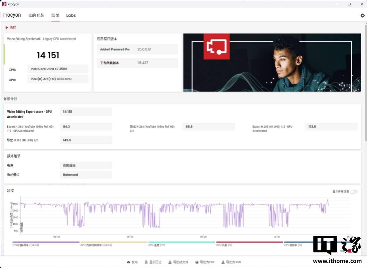 在 UL Procyon 的视频编辑基准测试中,酷睿 Ultra X7 处理器 358H 得分为 14151 分,相比酷睿 Ultra 9 处理器 285H 的 10941 分,提升了 29.3%。