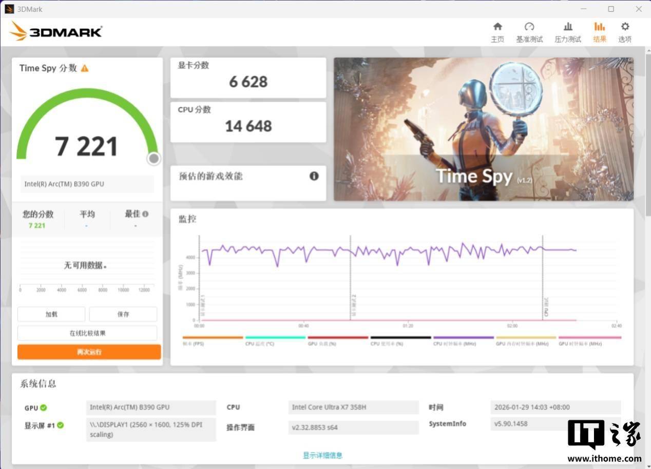 显卡部分的提升确实不小,Time Spy 图形分为 6628 分,相比上一代 intel Arc 140T 核显的 4166 分,性能提升幅度高达 59%。