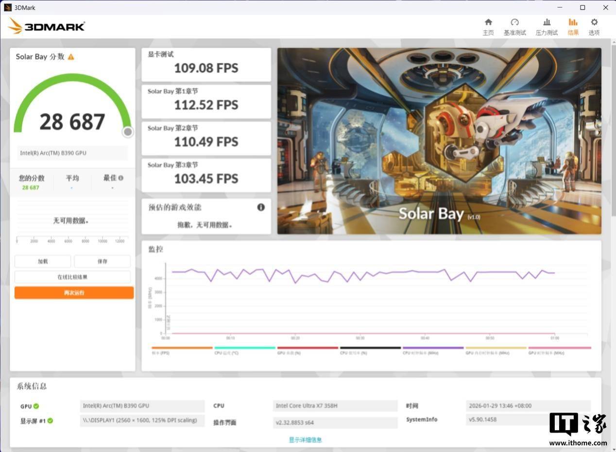 在 Solar Bay 光追项目测试中,酷睿 Ultra X7 处理器 358H 的综合分数为 28687 分,显卡综合帧为 109 FPS。