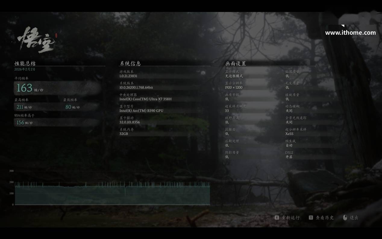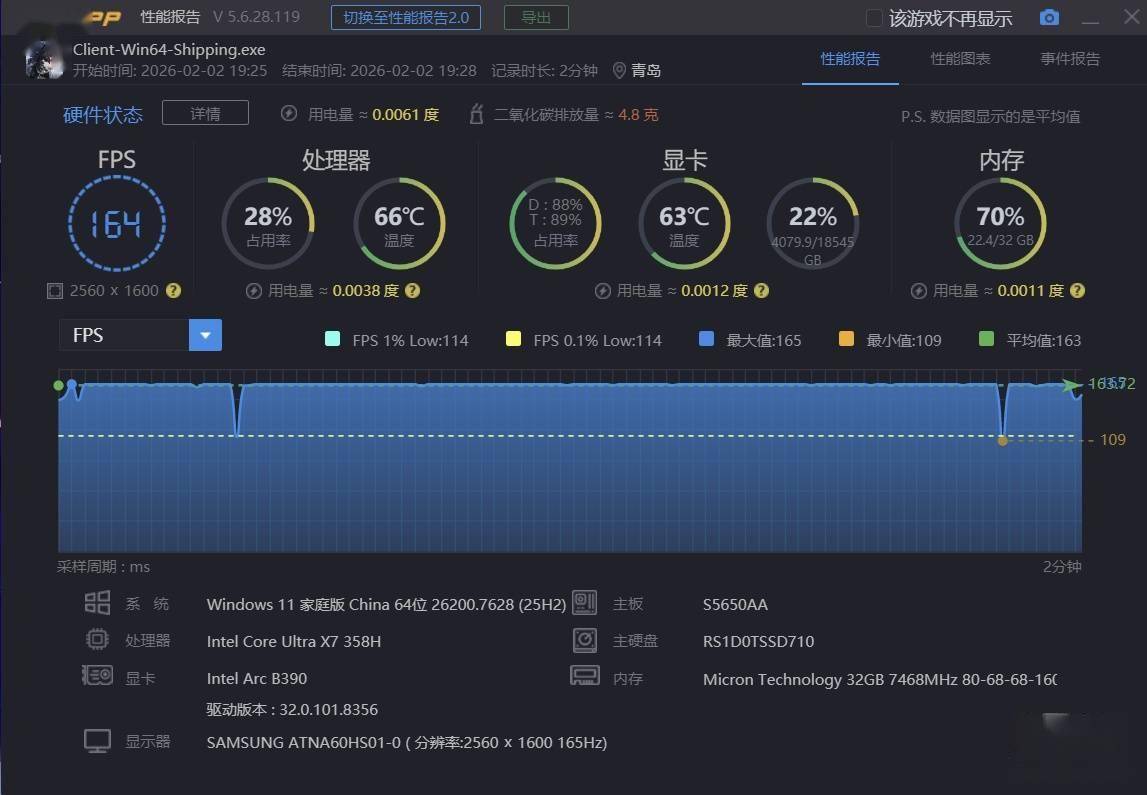 然后,我们再进一步开启帧生成选项,此时游戏平均帧数暴涨到 163 帧,几乎可以跑满这款 165Hz 的高刷屏,不得不说即便只是核显,intel XeSS 的多帧生成技术也足够强悍,以后出差用轻薄本打游戏再也不是做白日梦了。