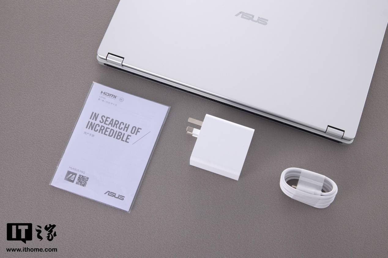 配件方面,华硕无畏Pro16 2026 酷睿版标配一个白色 100W 功率的 3 脚电源适配器,一根双 C 口白色电源线,外出携带收纳较为方便。