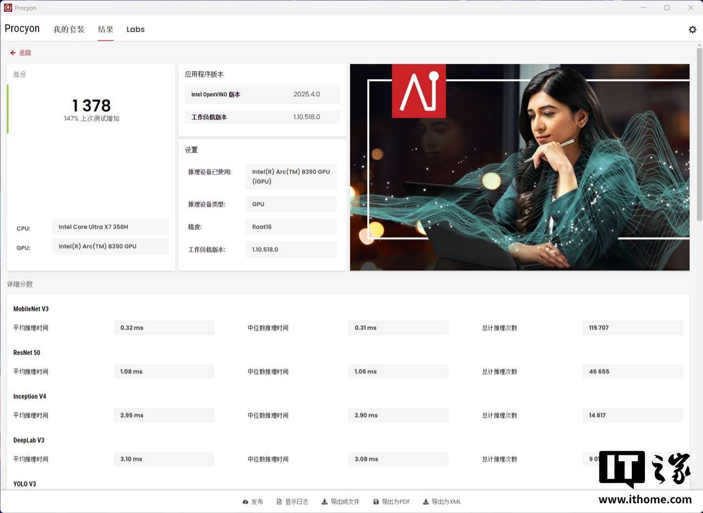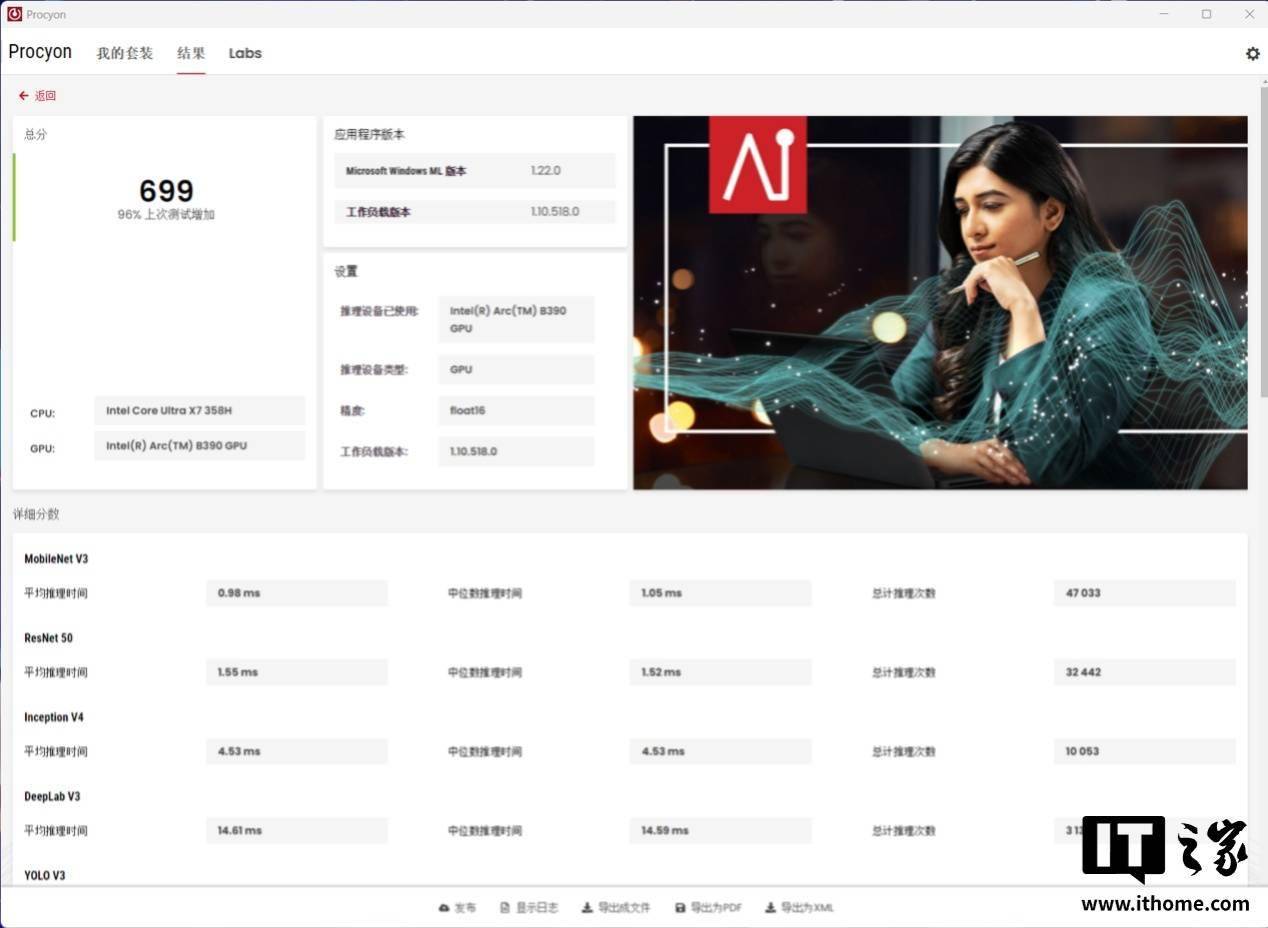 另外,既然它是一台 AI PC,那 AI 性能我们也得评估一下。在 UL Procyon 的 Microsoft Windows ML 测试中,GPU 的 float16 成绩为 699 分,float32 成绩为 356 分。