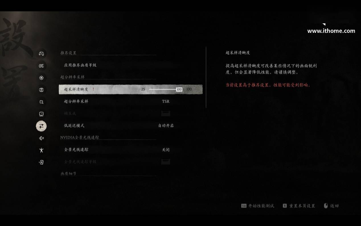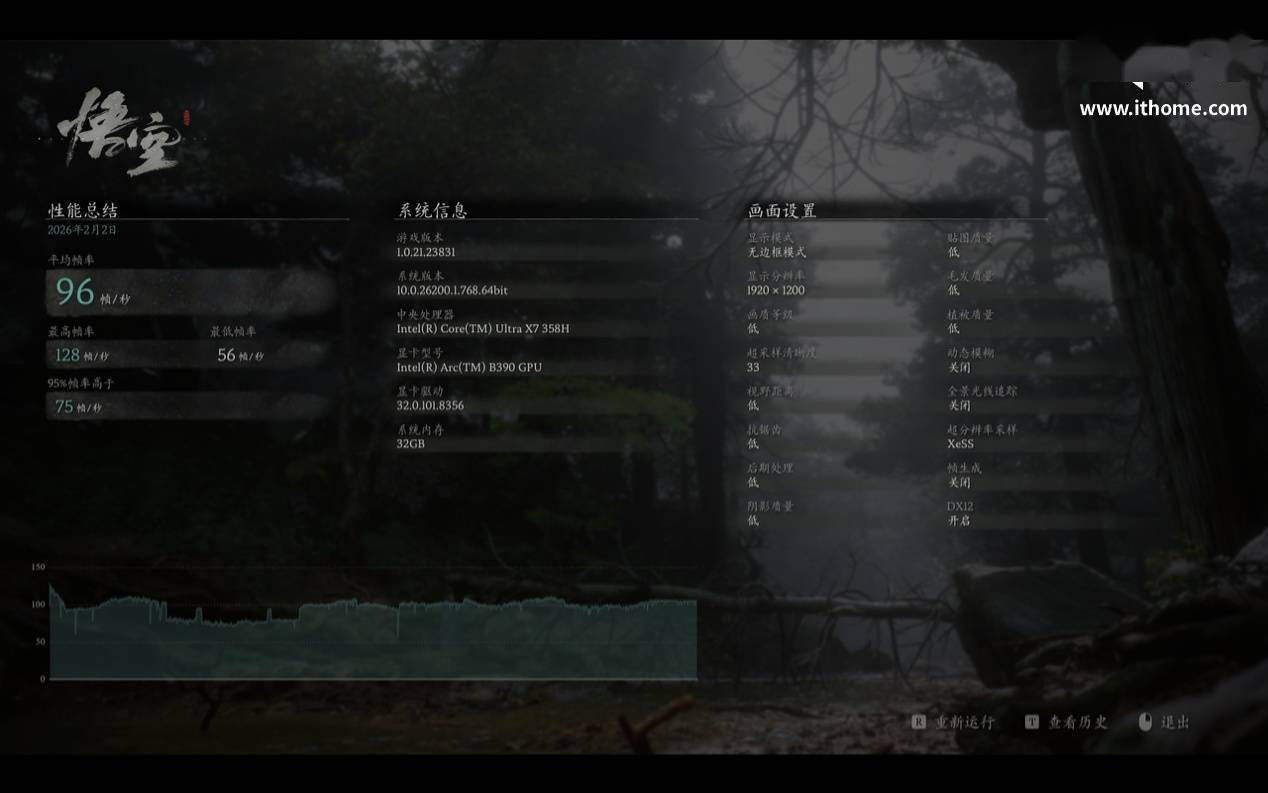 好在这款游戏支持 XeSS,我们在第一次测试的基础上,将超采样清晰度选项调整为 33% XeSS,再次测试,此时游戏平均帧数提升至 96 帧,差点破百,即使不打开帧生成选项,运行起来也足够流畅了。