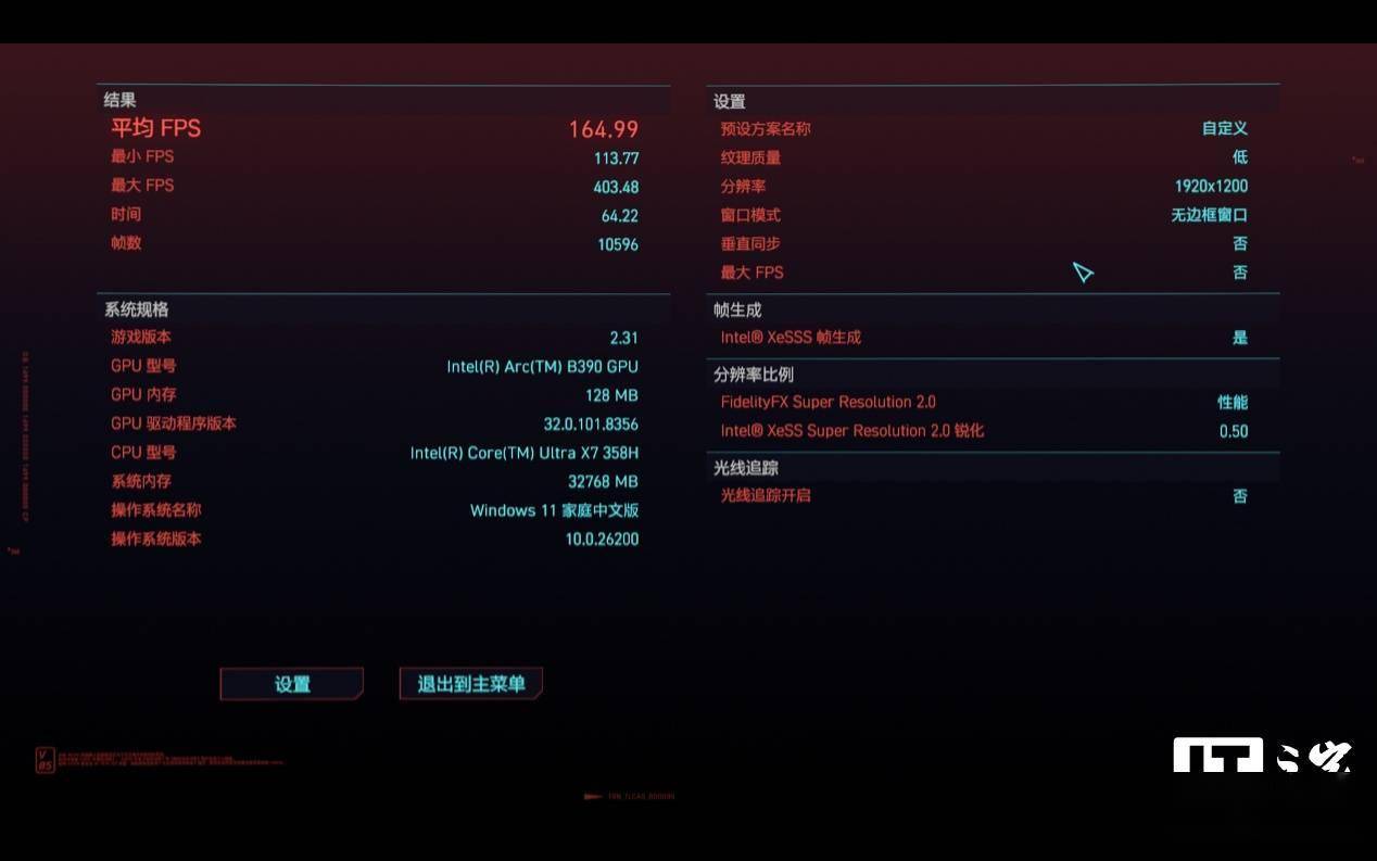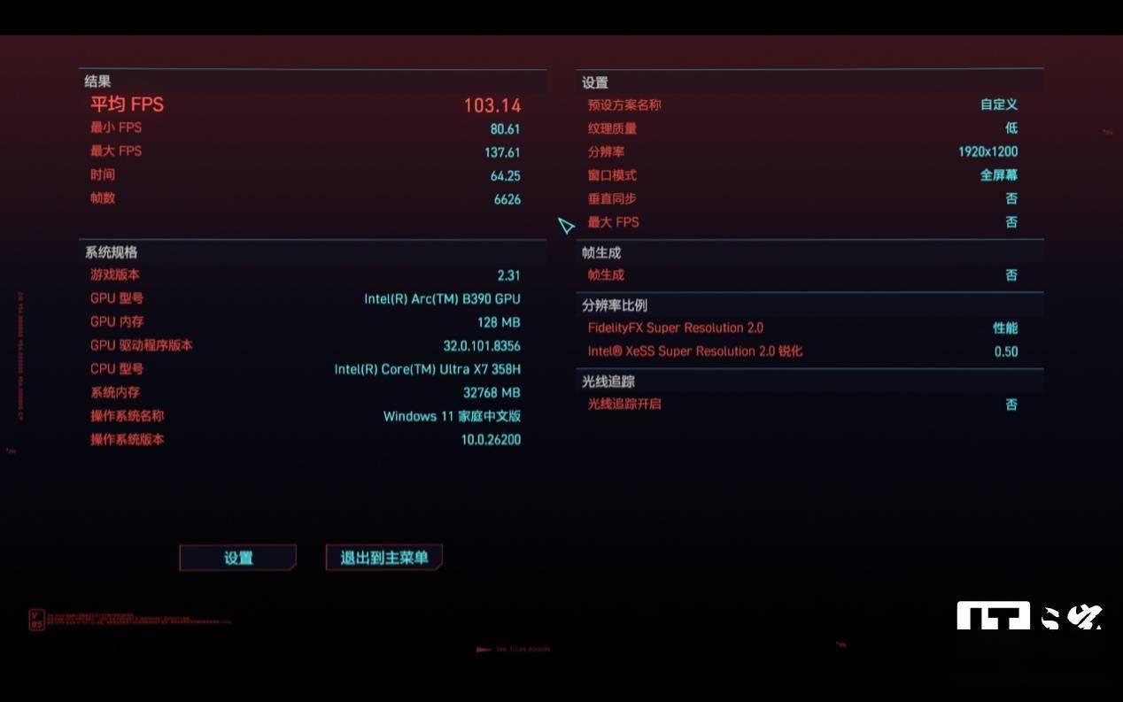 第二次测试中,我们进一步开启 XeSS 性能档选项后,游戏平均帧数提升至 103 帧。