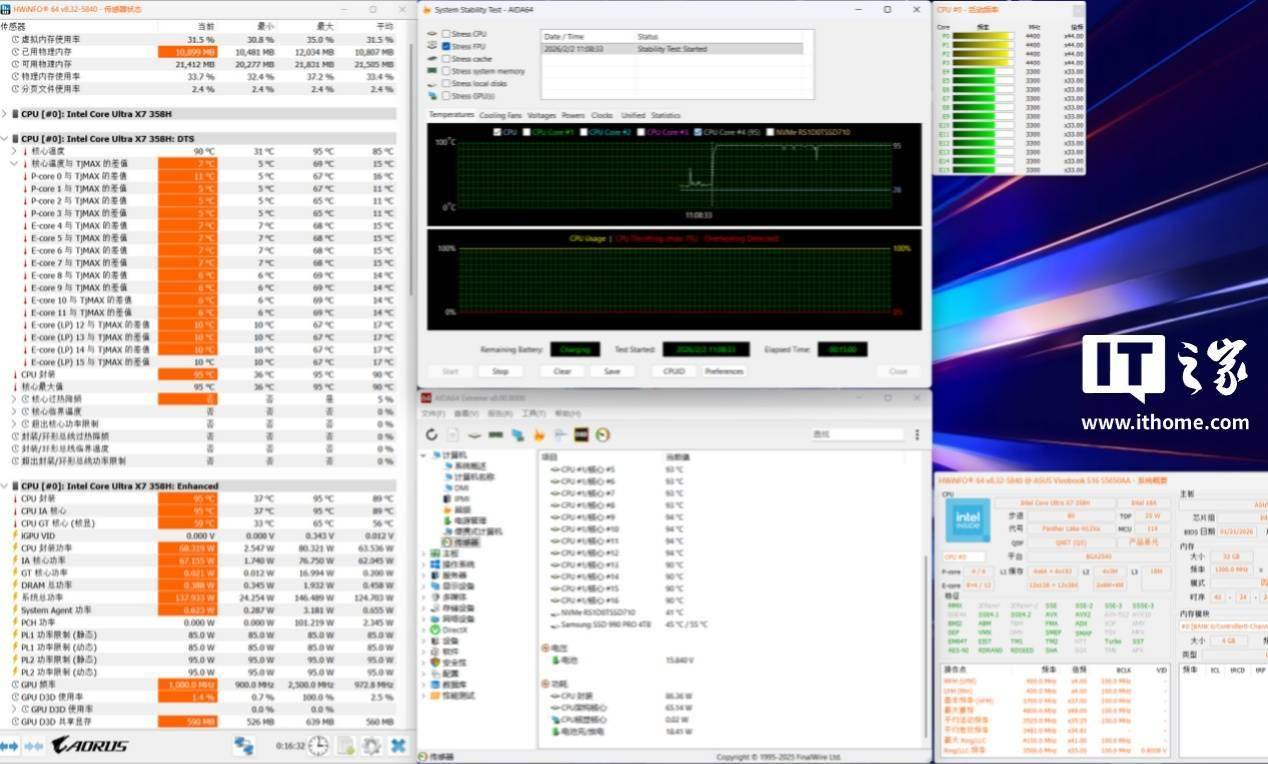 另外,此时的 CPU 核心温度为 90℃,CPU 封装温度为 95℃,不过并没有出现降频的问题。CPU 核心频率上,4 个性能核心保持在 4.4GHz,其它 8 个能效核心则统一保持在 3.3GHz。